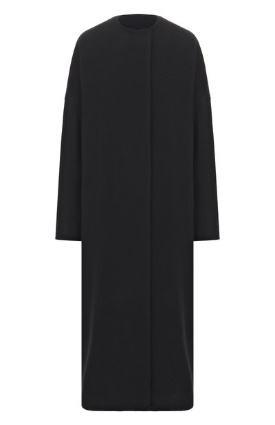 Для пошива однобортного пальто со спущенной линией плеч и круглым вырезом использовали микс шерсти, хлопка, акрила и полиэстера. Модель свободного кроя застегивается потайными пуговицами.
