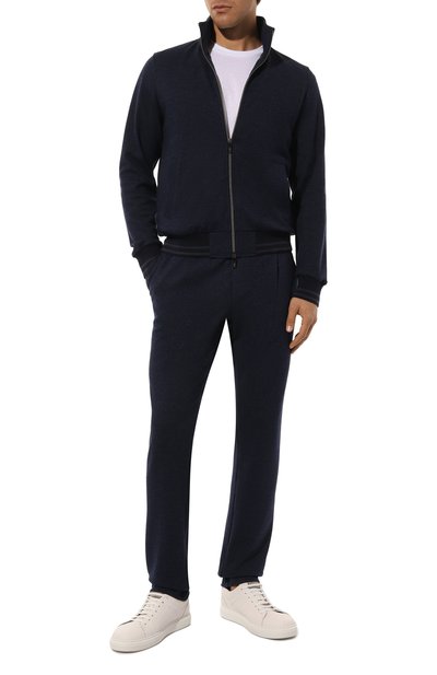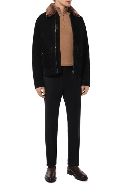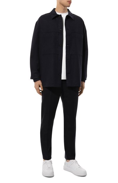 Брюки с регулируемым поясом-кулиской выполнили из смесовой ткани на основе шерсти и шелка. Модель с проглаженными стрелками и двумя боковыми карманами дополнили парой задних, украсив один из них брендированной нашивкой.