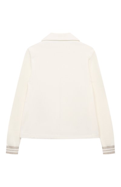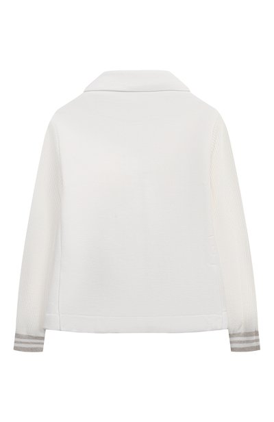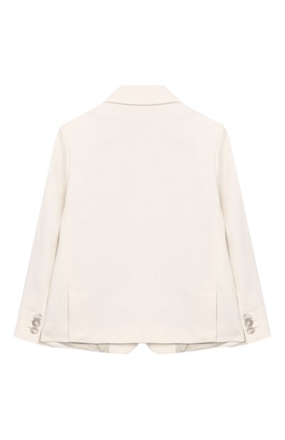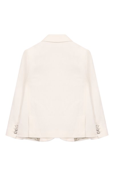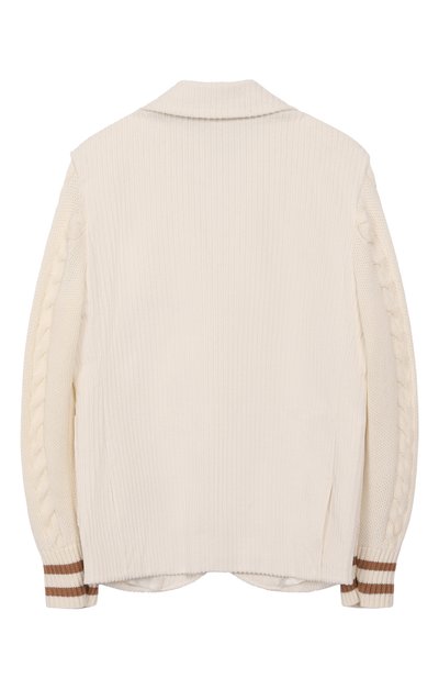 Однобортный пиджак выполнили из хлопкового вельвета в широкий рубчик, а рукава с арановыми узорами и манжетами с контрастной полоской – из трикотажа. Модель на двух пуговицах дополнили накладными боковыми карманами.