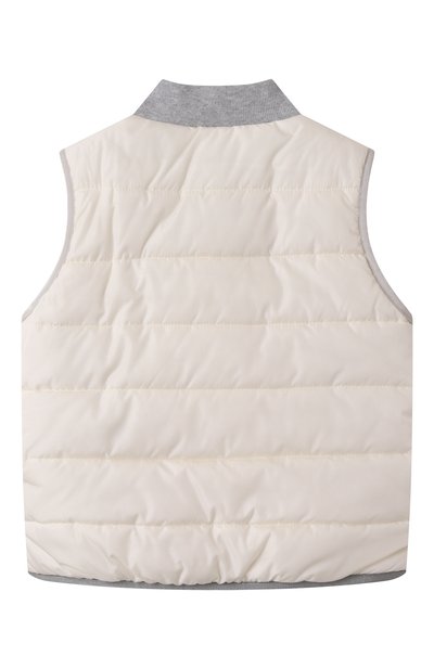 Стеганый жилет со вставками из гладкой ткани выполнили из вискозы с добавлением шерсти, а для подклада использовали полиэстер. Модель с воротником-стойкой и двумя боковыми карманами застегивается брендированными кнопками.