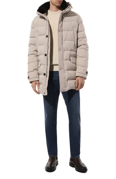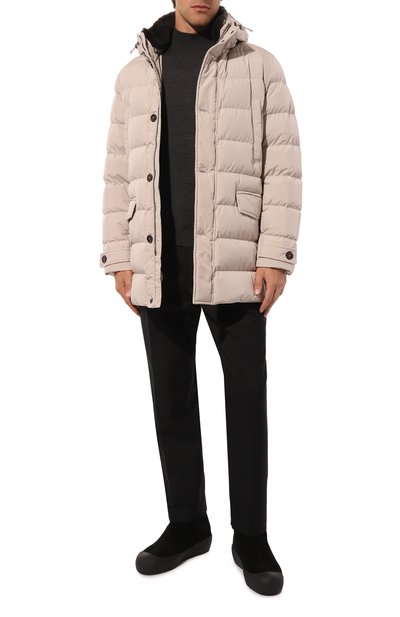 Стеганый пуховик Calandri-KN со съемным капюшоном выполнили из биэластичного материала на основе полиамида. Куртку на пуговицах дополнили парой карманов внутри, а также двумя с клапанами и одним на молнии по бокам.
