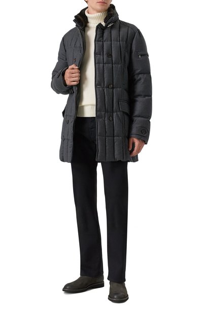 Стеганую пуховую куртку Calandri-KN на пуговицах выполнили из эластичного материала на основе полиамида. Модель со съемными капюшоном и нагрудником дополнили двумя боковыми карманами с клапанами и одним с молнией, а также парой внутренних.