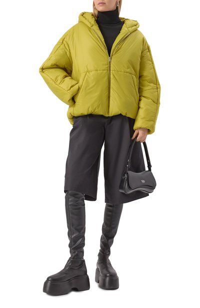 Стеганую куртку Pika из ткани на основе полиэстера и нейлона утеплили утиным пухом. Модель с асимметричным низом и высоким воротом, переходящим в объемный капюшон, дополнили внутренним и парой внешних карманов. Пуховик застегивается молнией