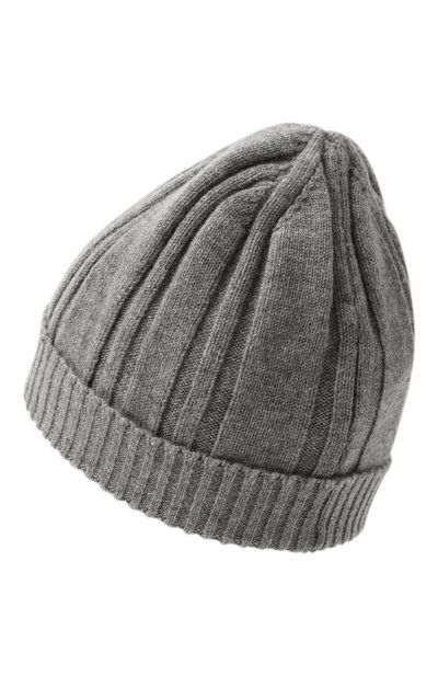 Меланжевую шапку бини связали из шерсти первого пострига. Аксессуар с фирменными белыми стежками декоративно состарили при помощи потертостей на широком отвороте в рубчик.