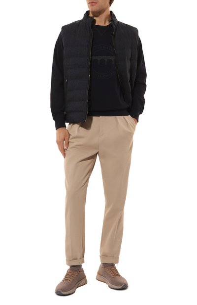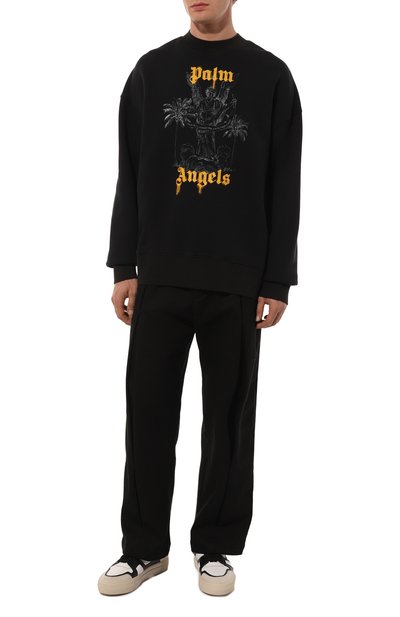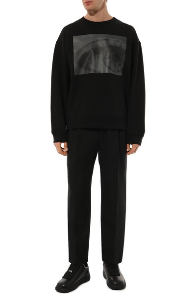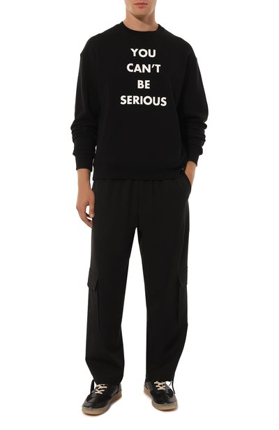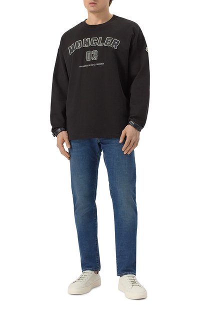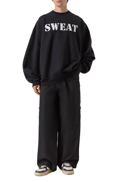 Свитшот с неглубокой круглой горловиной, поясом и манжетами в рубчик выполнили из хлопкового трикотажа. Модель со знаковой строчкой на спинке украсили крупной литерой М и вставкой с фирменным числовым кодом спереди.