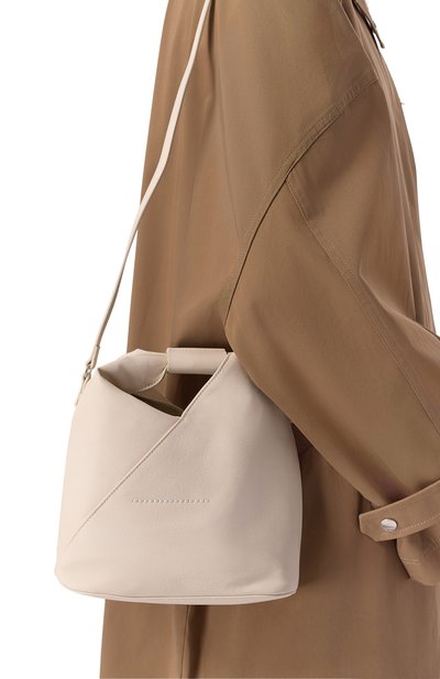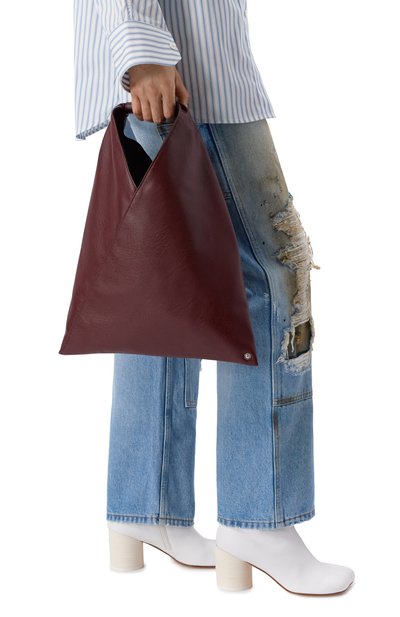 Сумку Japanese, вдохновленной искусством оригами, выполнили из зернистой экокожи. Аксессуар с внутренним карманом дополнили кнопками, позволяющими менять форму модели. Ручку украсили тисненым числовым кодом, а заднюю сторону — фирменной строчкой.