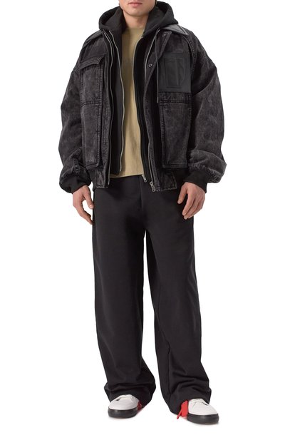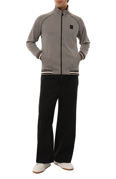 Бомбер Gordon на гусином пуху выполнили из полушерстяной ткани с узором houndstooth. Модель с воротом, поясом и манжетами из однотонного трикотажа в рубчик дополнили боковыми карманами и съемными лямками. Рукав куртки украсили брендированным патчем, а спинку — фирменным слэшем.
