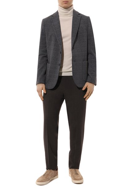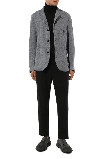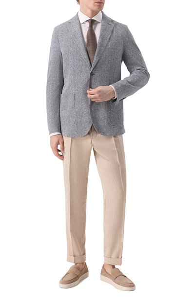Однобортный пиджак выполнили из эластичной хлопковой ткани с шевронным узором. Модель с прямоугольными лацканами, которые можно застегнуть наглухо, дополнили нагрудным и двумя накладными карманами.