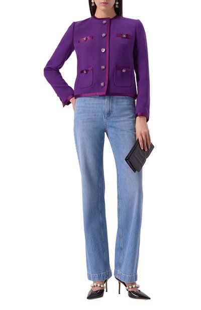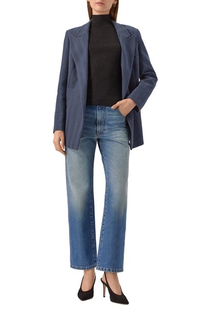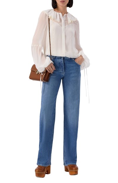 Джинсы прямого кроя выполнили из неэластичного денима. Выбеленную модель с пятью карманами декорировали потертостями по краям и брендированным кожаным патчем сзади.