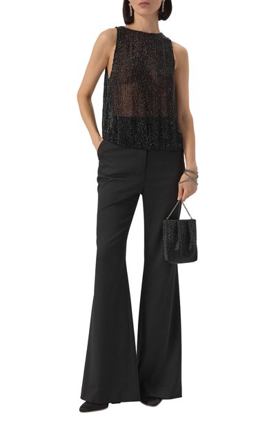 Драпированный топ с рифлеными проймами и вырезом-лодочкой выполнили из фирменного вискозного трикотажа с добавлением нейлона. Полосатый узор модели на молнии сбоку подчеркнули нитями ламе и пайетками.