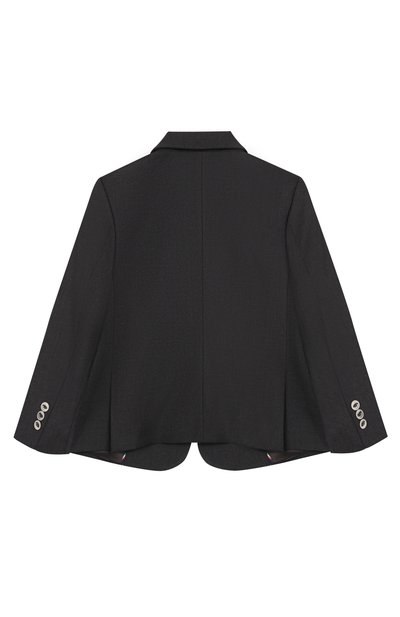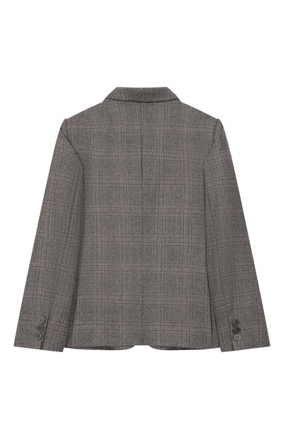Пиджак на вискозном подкладе выполнили из шерсти в клетку гленчек. Однобортная модель с двумя боковыми карманами и нагрудной листочкой застегивается брендированными пуговицами.