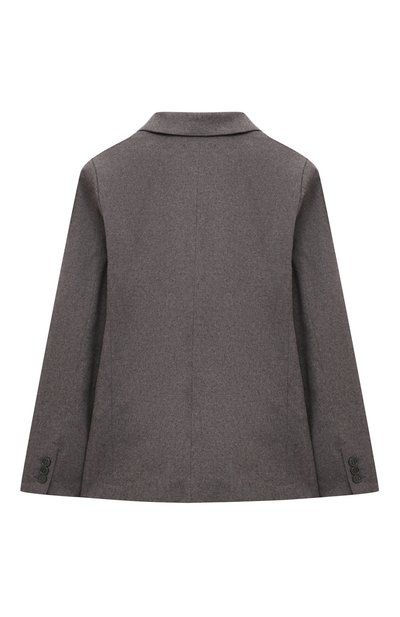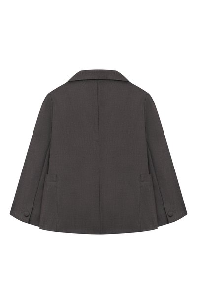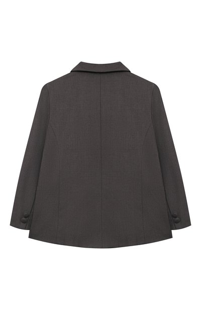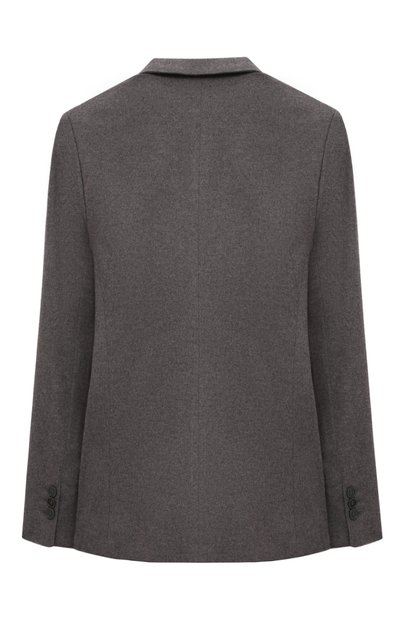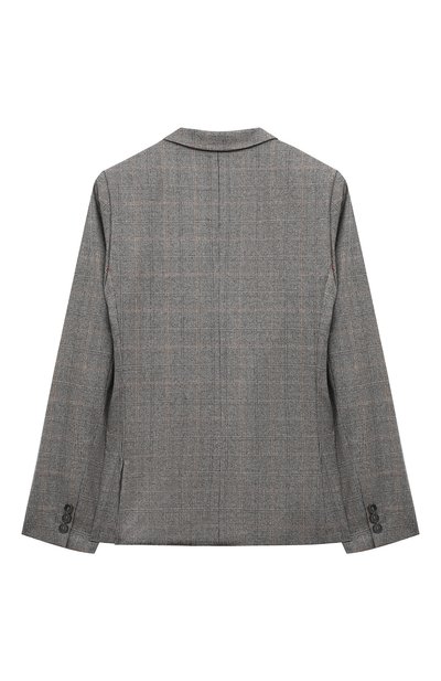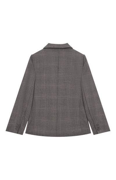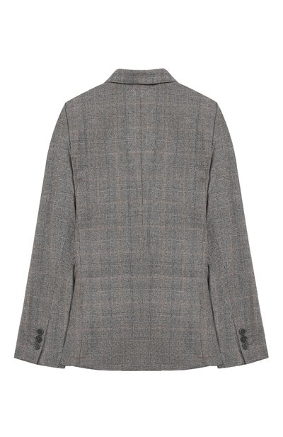 Клетчатый жакет на пуговицах в тон выполнили из шерсти, а для изготовления подклада использовали вискозу. Двубортную модель дополнили парой боковых карманов с узкими листочками.