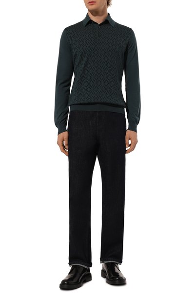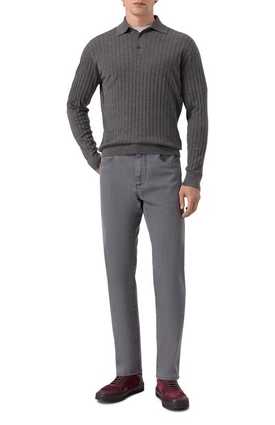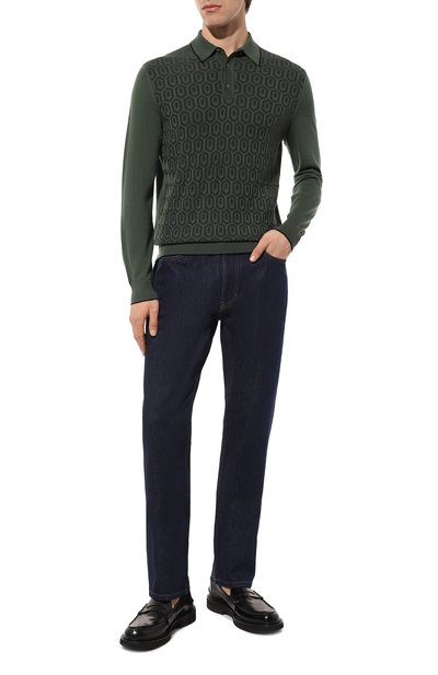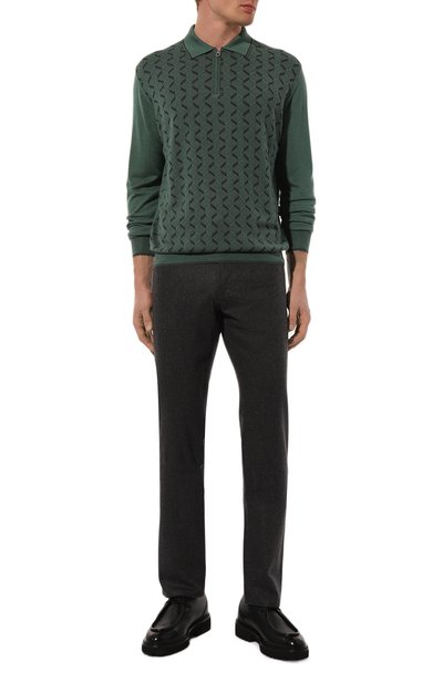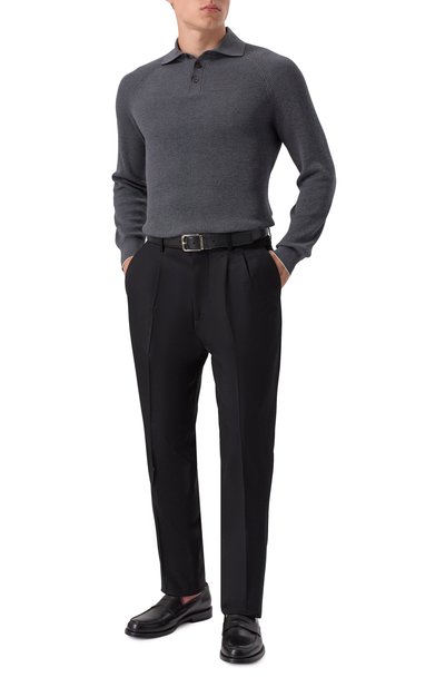 Поло с фактурным узором связали из двухцветной шерстяной пряжи. Модель с V-образной горловиной дополнили воротником, манжетами и поясом в рубчик.