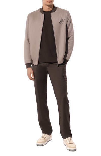 Брюки из шерсти стрейч будут уместны как в повседневном, так и в нестрогом офисном образе. Модель с четырьмя карманами украсили брендированным патчем на поясе, а на одной из шлевок вышили логотип.