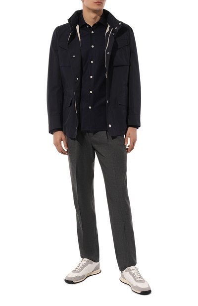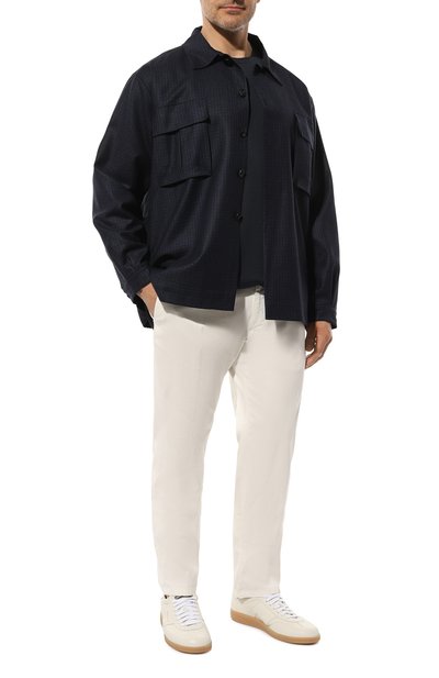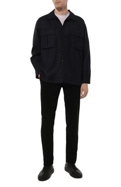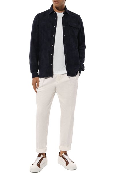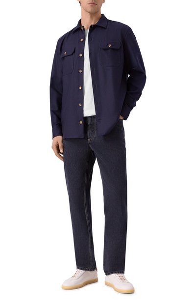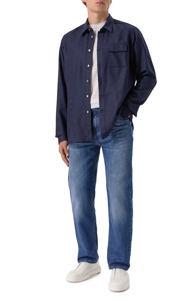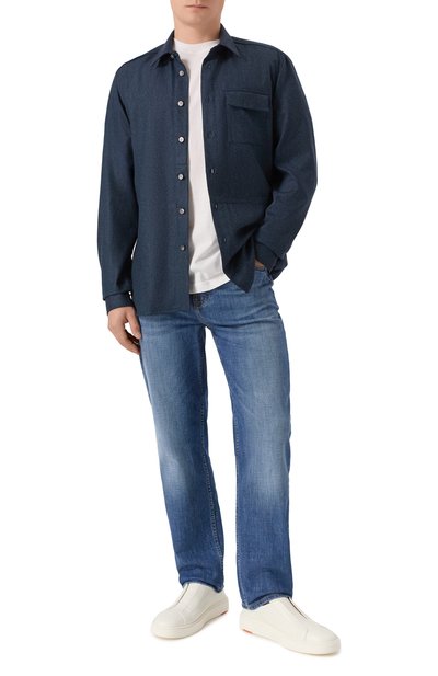 Рубашку с фигурным низом и скошенными манжетами выполнили из стрейчевой шерстяной фланели. Модель с парой защипов на спинке дополнили двумя нагрудными карманами с клапанами.