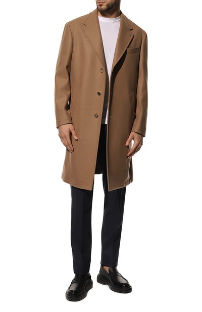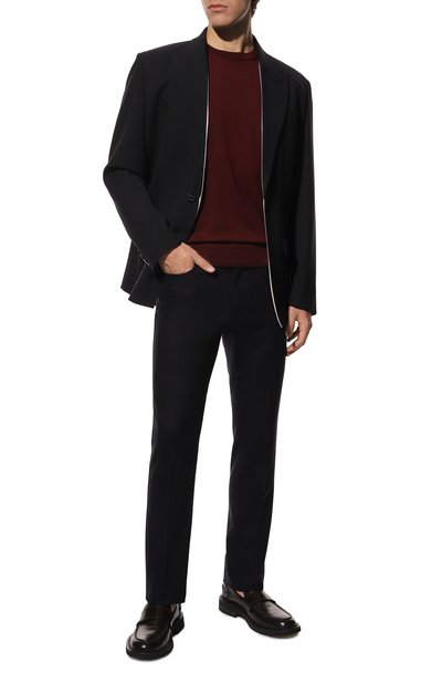 Брюки с защипами, стрелками и эластичной вставкой на поясе сзади дополнили четырьмя карманами. Для изготовления модели использовали костюмную шерсть.