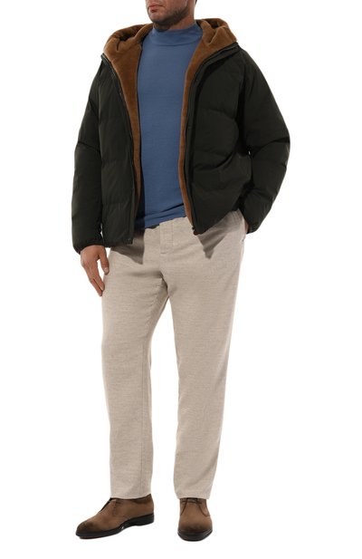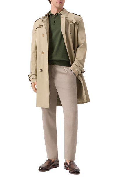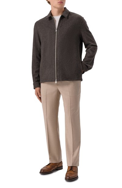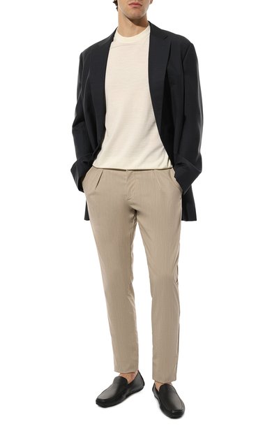 Брюки со стрелками и четырьмя карманами выполнили из костюмной шерсти. Модель с брендированной нашивкой на эластичном поясе украсили ярлыком в тон фирменной пуговице алого оттенка.