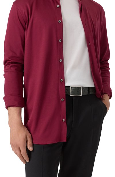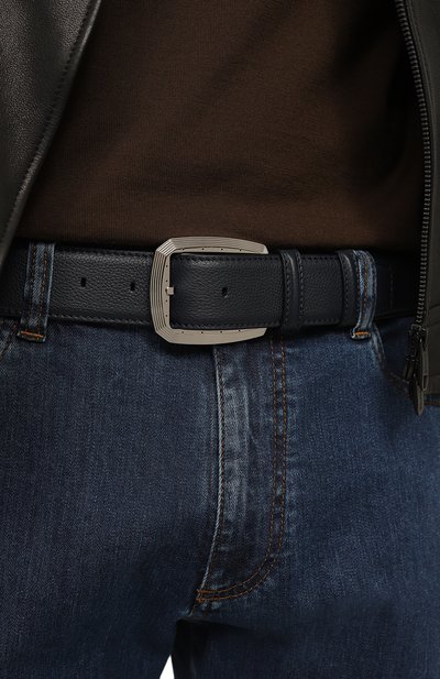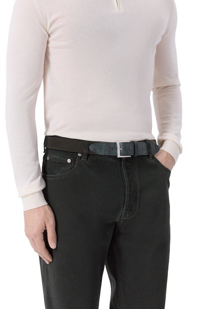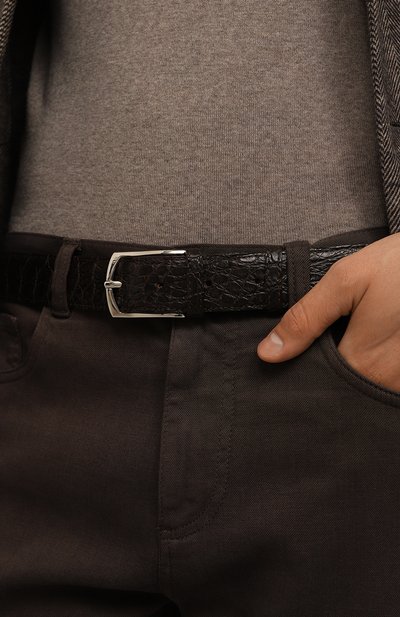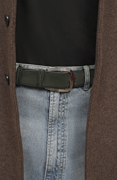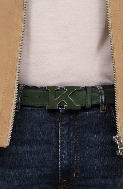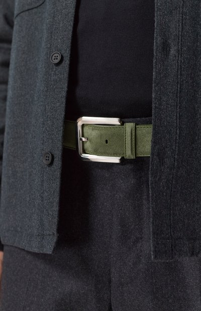 Для изготовления ремня использовали бархатистую замшу. Аксессуар с двумя тренчиками и вышитым логотипом застегивается прямоугольной металлической пряжкой.
