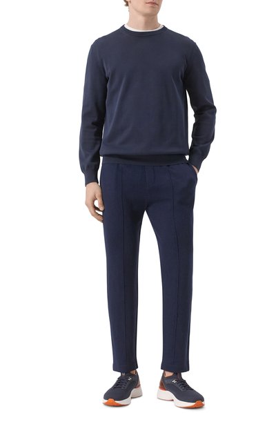 Кроссовки из комбинации твила и замши украсили двумя рядами стежков фирменного алого оттенка. Контрастную подошву дополнили рельефным логотипом, а язычок – брендированным патчем.