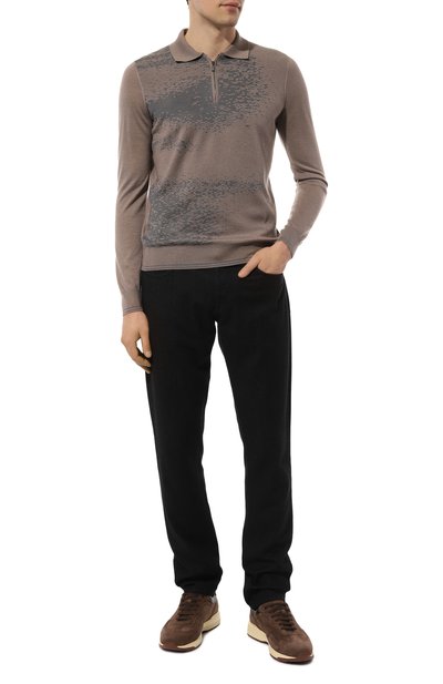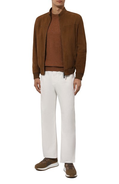 Кроссовки на многослойной подошве изготовили из замши и плотного текстиля. Модель украсили стежками фирменного алого оттенка по бокам и нашивкой с тисненым логотипом на язычке.