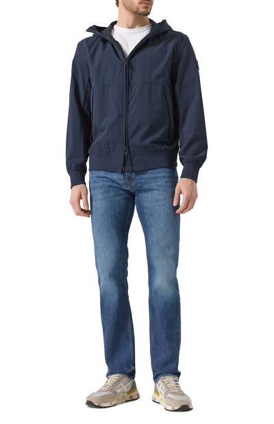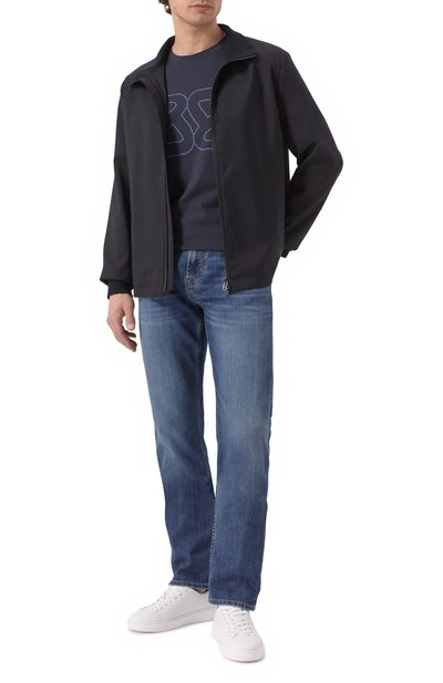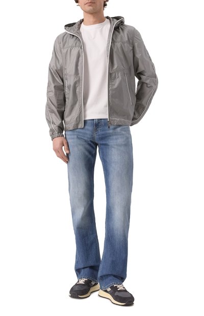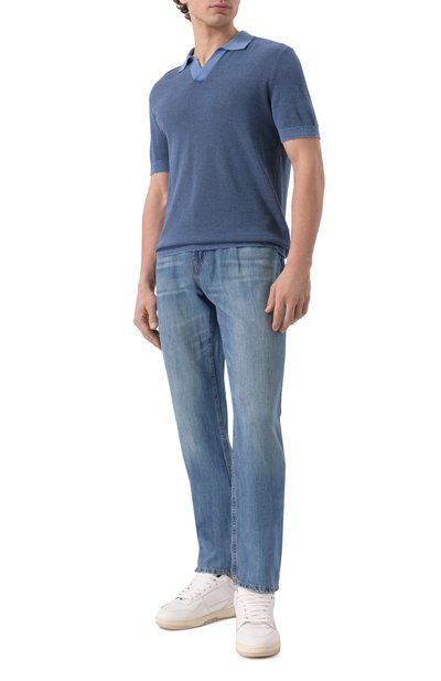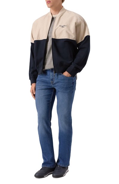 Джинсы кроя Modern Straight выполнили из выбеленного хлопкового денима с декоративными заломами и потертостями. Модель традиционно дополнили пятью карманами.