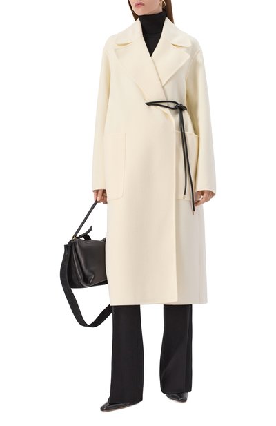 Пальто Davide с шалевым воротником и двумя врезными карманами сшили из шерсти double face с добавлением шелка. Модель с высокими боковым разрезами дополнили поясом-лентой.