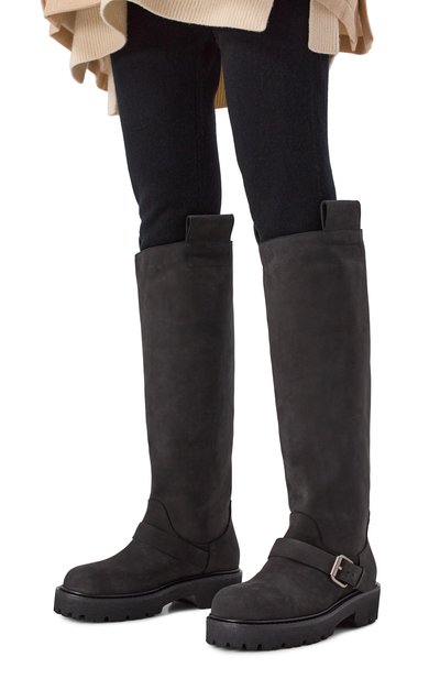 Замшевые сапоги на литой резиновой подошве с небольшим каблуком утеплили овчиной. Модель с петлей на голенище дополнили короткой молнией сбоку.