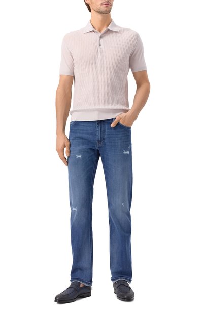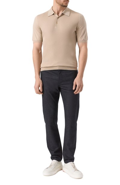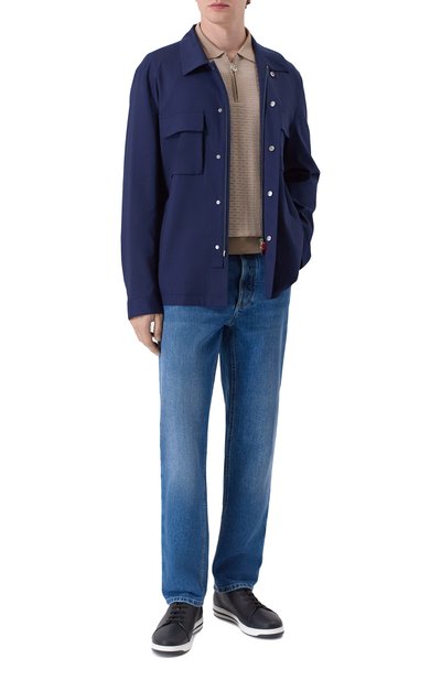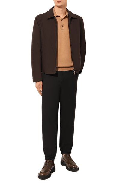 Поло с манжетами и поясом в рубчик сшили из шелкового трикотажа с рельефным геометрическим узором. Модель застегивается короткой молнией с брендированным пуллером и отделкой из кожи аллигатора.