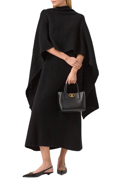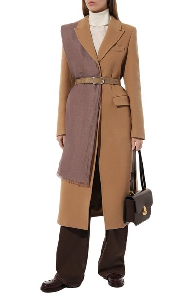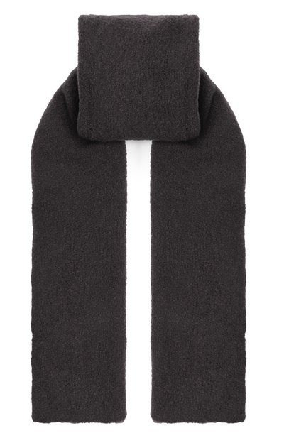 Длинный шарф с необработанными краями выполнили из фактурного кашемира, усиленного полиамидом. Ширины аксессуара хватит, чтобы накинуть его как палантин.