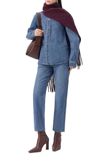 Широкий шарф может стать альтернативой палантину. Аксессуар выполнили из буклированной кашемировой пряжи с добавлением нейлона.