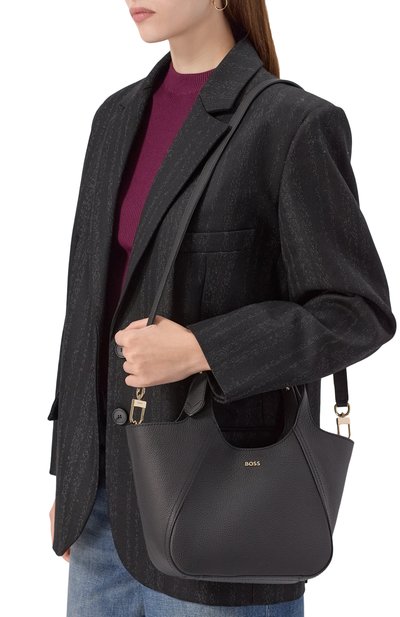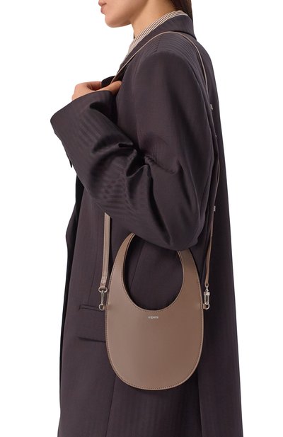 Сумку Swipe с логотипом марки спереди выполнили из гладкой кожи. Модель с цельнокроеной ручкой дополнили съемным регулируемым ремнем.