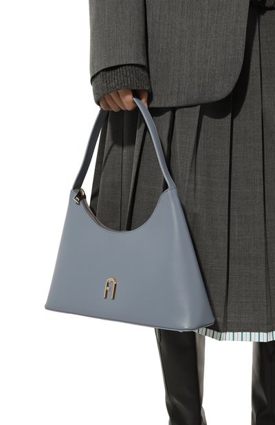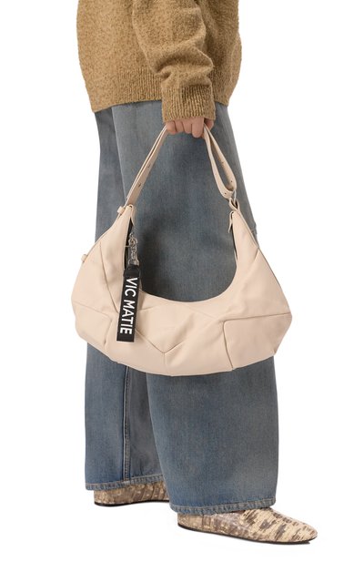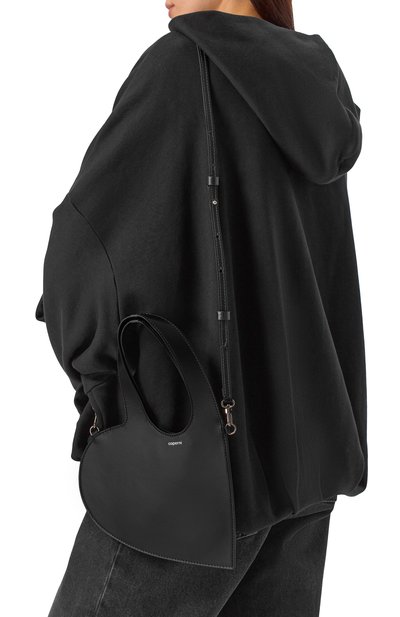 Для создания сумки в форме сердца использовали металлизированную кожу с контрастной внутренней отделкой. Аксессуар с короткими ручками дополнили съемным плечевым ремнем, который регулируется по длине.