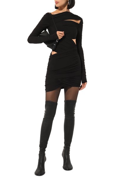 Облегающее мини-платье с длинными рукавами выполнили из блестящего эластичного материала на основе полиамида. Модель с асимметричным вырезом декорировали мелкими драпировками.