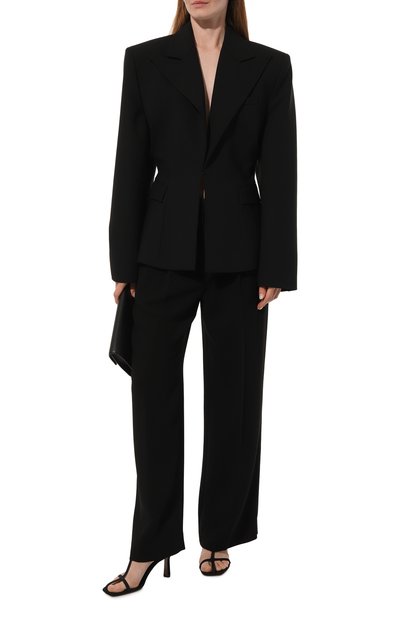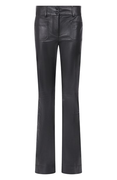 Расклешенные брюки выполнили из мелкозернистой кожи. Модель со шлевками и двумя кнопками в тон на поясе дополнили парой накладных карманов.