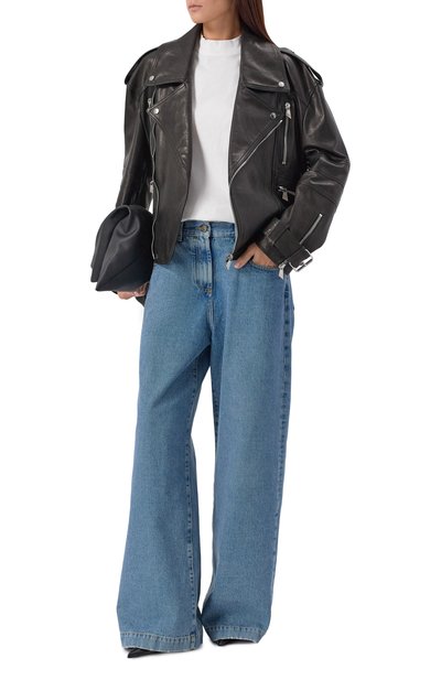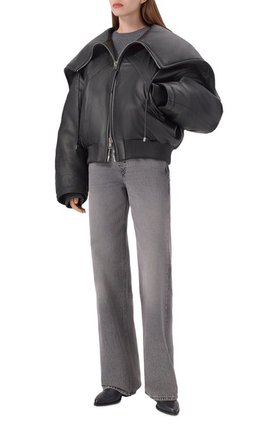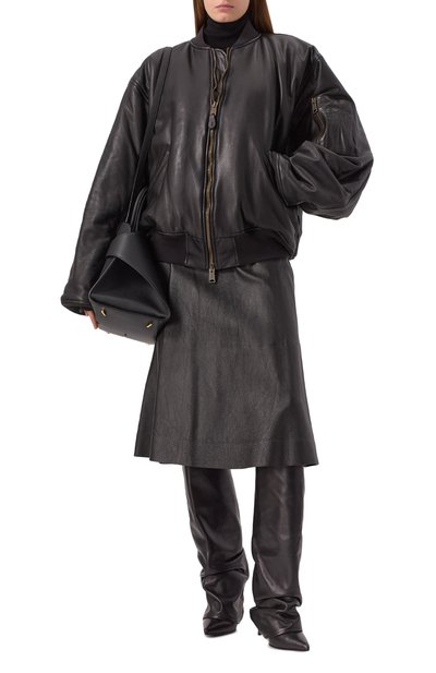 Косуху с эластичным поясом и прямоугольными манжетами на двух кнопках выполнили из кожи. Куртку со спущенной линией плеч и погонами дополнили двумя боковыми карманами.