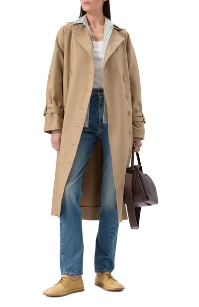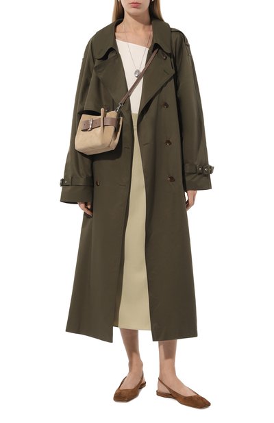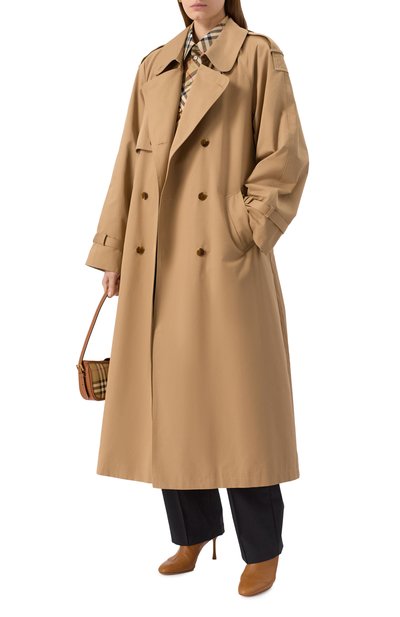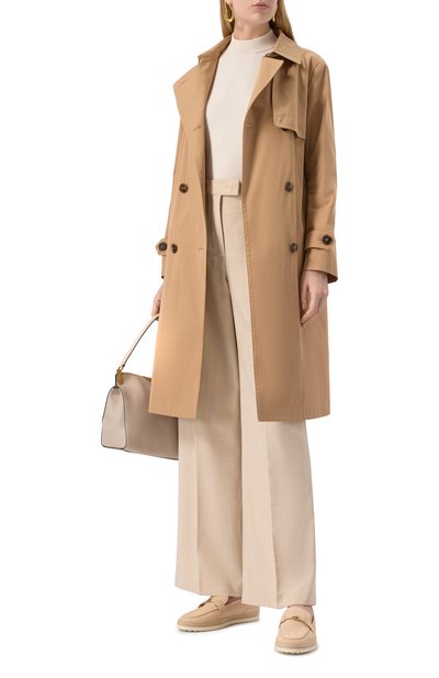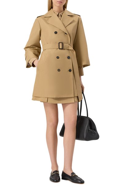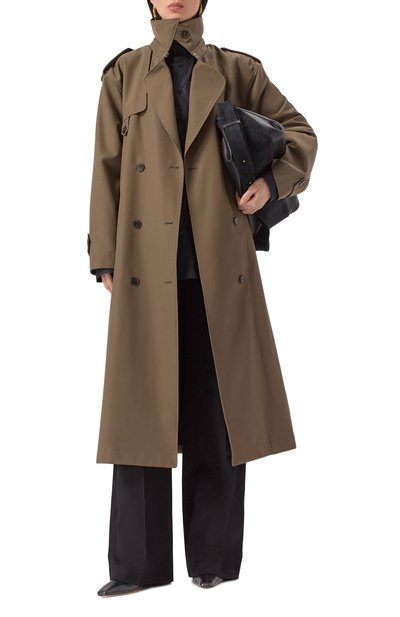 Для изготовления однобортного плаща Agatha с отлетной кокеткой и боковыми разрезами использовали влаго- и ветронепроницаемую мембранную ткань из хлопка и полиэстера. Представленную эксклюзивно в ЦУМе модель с патами на рукавах, поясом с пряжкой и двумя карманами дополнили съемной стеганой подстежкой на синтетическом утеплителе.