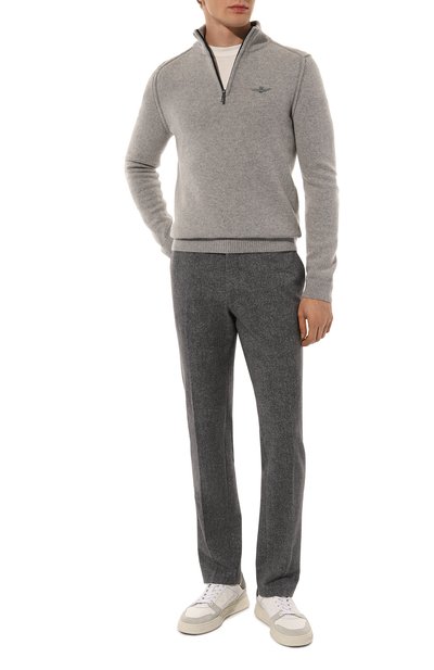 Брюки прямого кроя выполнили из стрейчевого хлопкового габардина, напоминающего деним. Модель с эластичными боковыми вставками на поясе и двумя парами карманов декорировали вышитой эмблемой ВВС Италии сзади.