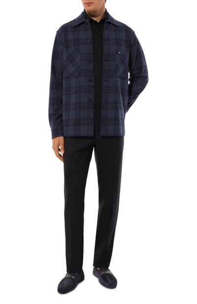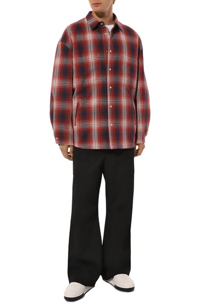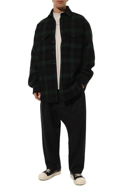 Клетчатую куртку-рубашку силуэта oversize выполнили из плотной шерстяной ткани. Модель с фигурным низом и накладными нагрудными карманами застегивается брендированными пуговицами.