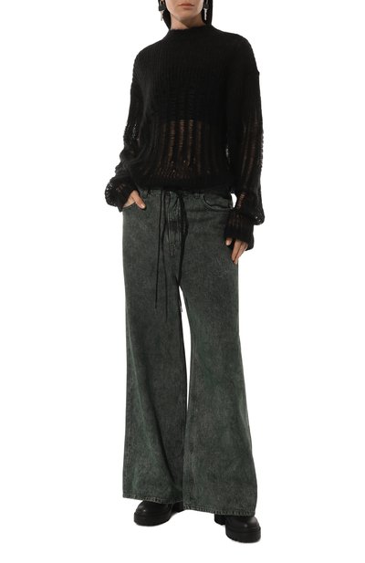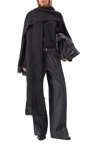 Декоративно состаренный свитер с длинной бахромой и петлями наружу связали из полушерстяной пряжи. Модель с круглой горловиной, манжетами и широким поясом в рубчик может дополнить образ с джинсами и мюлями.