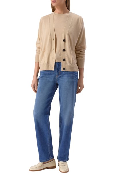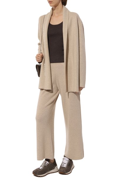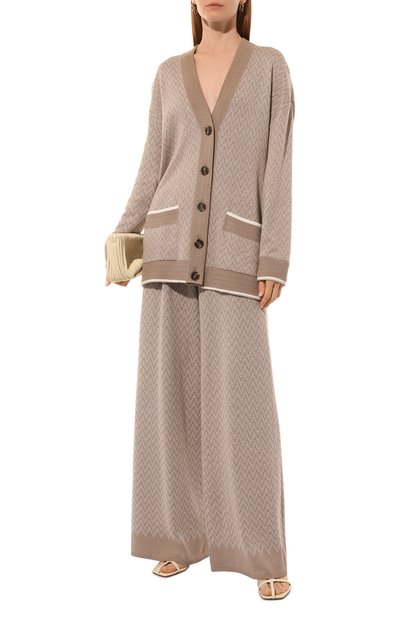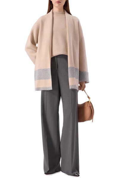 Кардиган свободного кроя связали узором в рубчик из шерстяной пряжи с добавлением кашемира. Модель с двумя накладными карманами дополнили съемной отделкой из густого козьего меха.