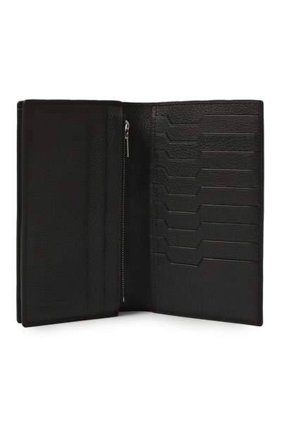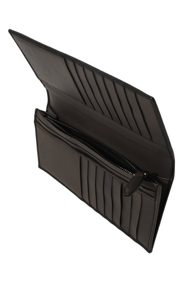 Портмоне с шестью слотами для карт и карманом на молнии сшили из телячьей кожи. Спереди аксессуар украсили тисненым логотипом марки.