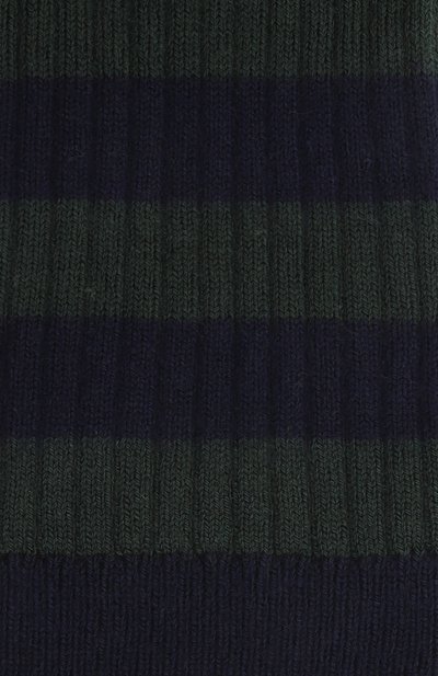Полосатые носки в рубчик связали из стрейчевой хлопковой пряжи с добавлением полиамида. Аксессуар с усиленными зонами нагрузки дополнили широкой эластичной манжетой.