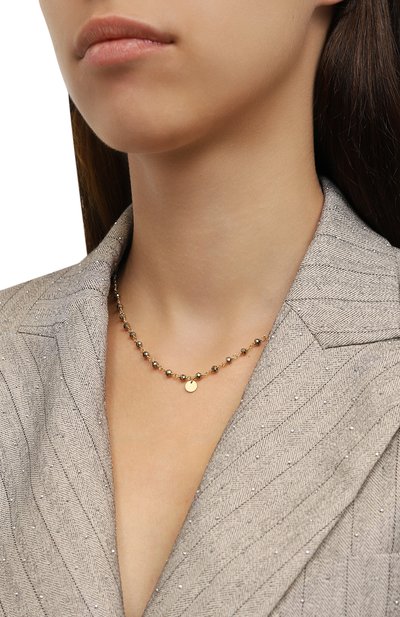 Колье-цепочку с круглыми звеньями и небольшим карабином выполнили из латуни с золотистым финишем. Единственным декором сделали прямоугольную вставку с выгравированным логотипом.