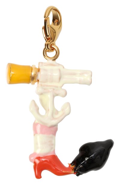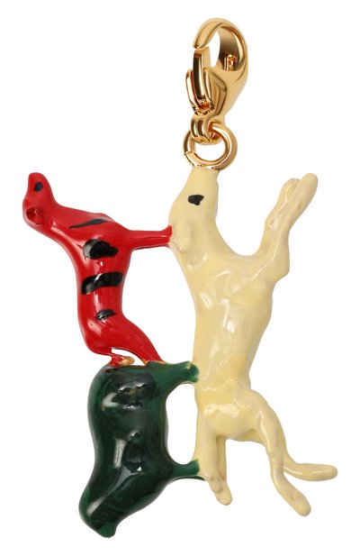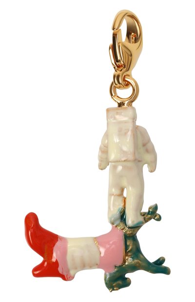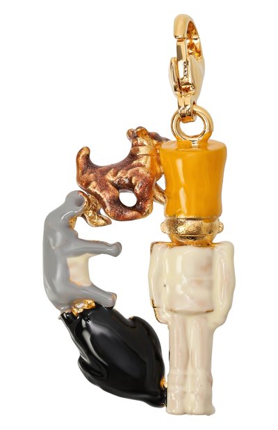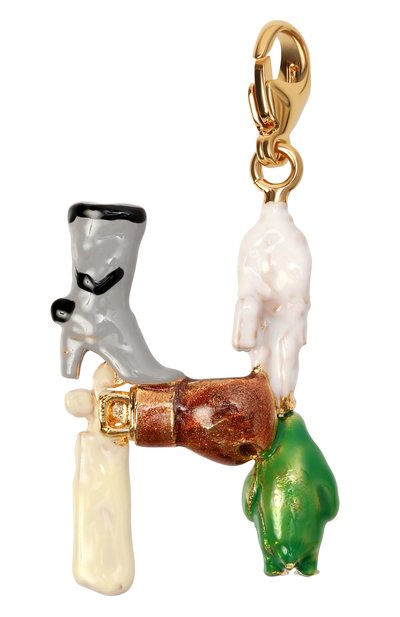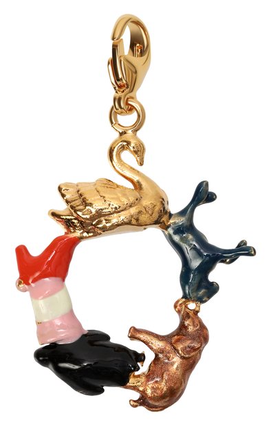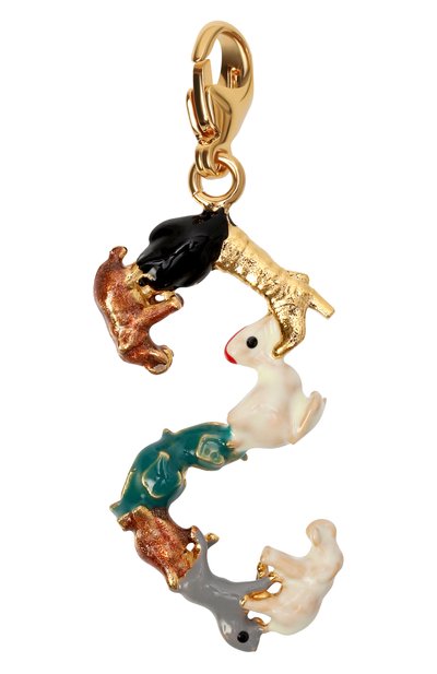 Подвеску-шарм в виде литеры U, словно собранной из фигурок животных, выполнили из латуни и вручную расписали цветной эмалью. Аксессуар дополнили крупным карабином.