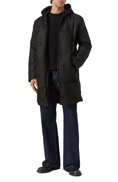 Для пошива однобортного пальто с капюшоном использовали ткань из шерсти с добавлением нейлона. Свободную модель с рельефными швами и декоративными молниями на рукавах и плечах дополнили двумя карманами по бокам и накладным сзади.