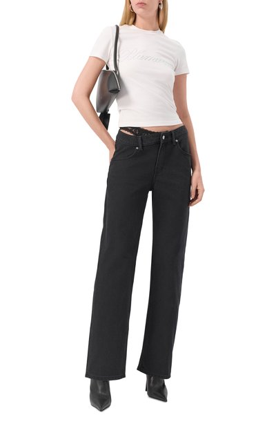 Комбинированные джинсы выполнили из хлопкового денима и гладкой кожи. Пояс изделия сзади дополнили брендированным патчем, а рядом с одним из пяти карманов модели закрепили миниатюрный ярлык.