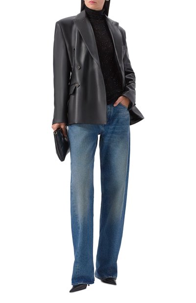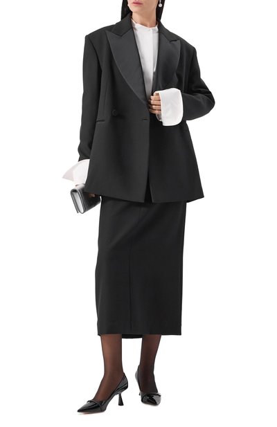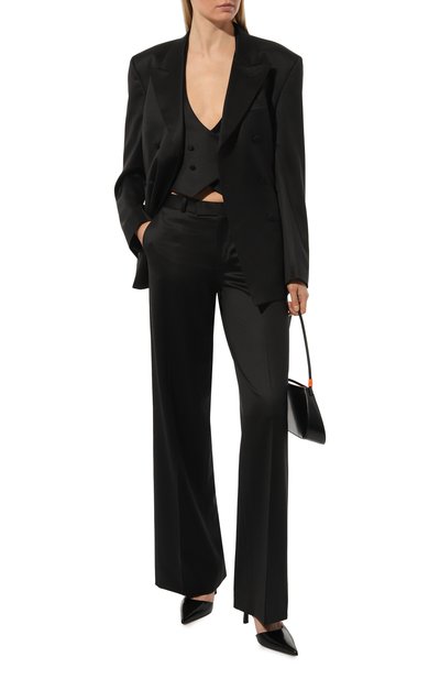 Двубортный жакет с акцентированной линией плеч и заостренными лацканами выполнили из гладкого полиэстера. Модель с двумя карманами с клапанами украсили кружевным кантом и фирменной накладкой на спинке.