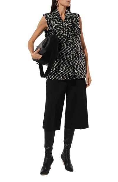 Клетчатый жилет с V-образной горловиной и боковыми карманами украсили бахромой вдоль фигурного низа. Модель из твида на основе хлопка и шерсти украсили россыпью кристаллов.
