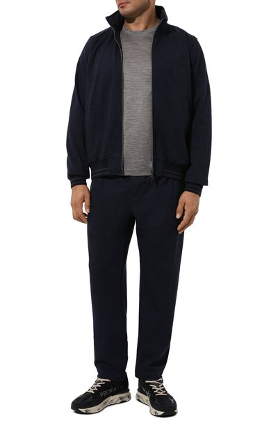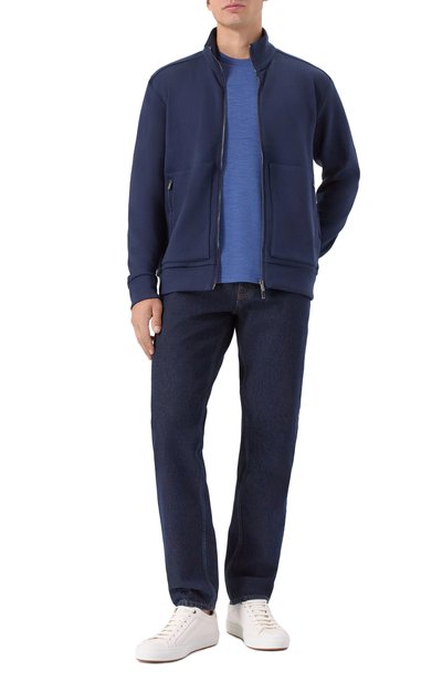 Толстовку с воротником-стойкой выполнили из стрейчевого трикотажа на основе полиэстера, модала и хлопка. Спереди модель с боковыми карманами на молниях декорировали миниатюрной вышивкой в виде фирменного акульего плавника.