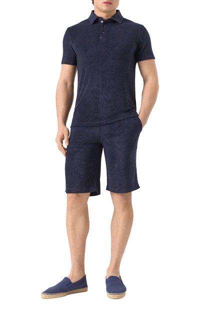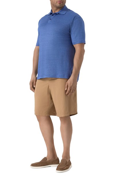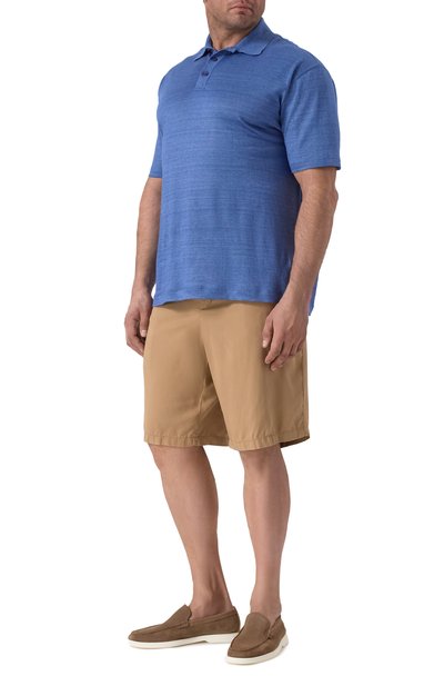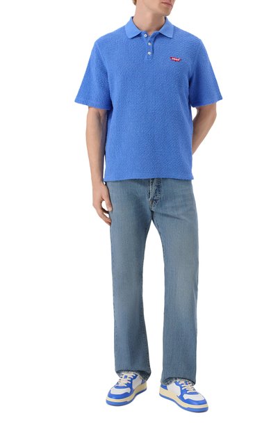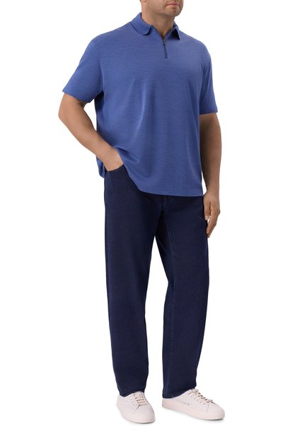 Поло прямого кроя выполнили из шерстяного трикотажа с добавлением шелка. Модель с короткой молнией украсили небольшим фирменным ярлыком сбоку.